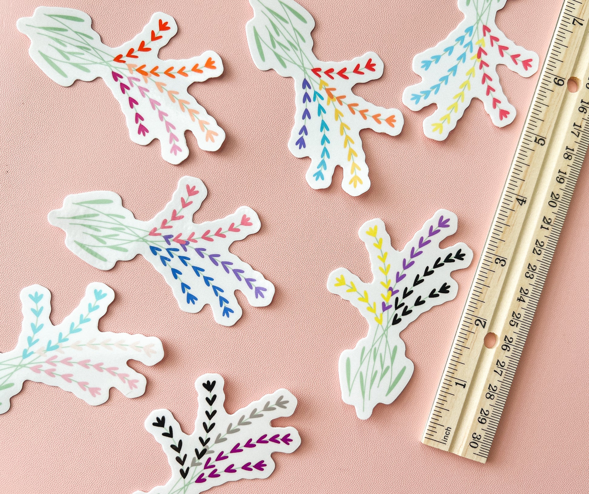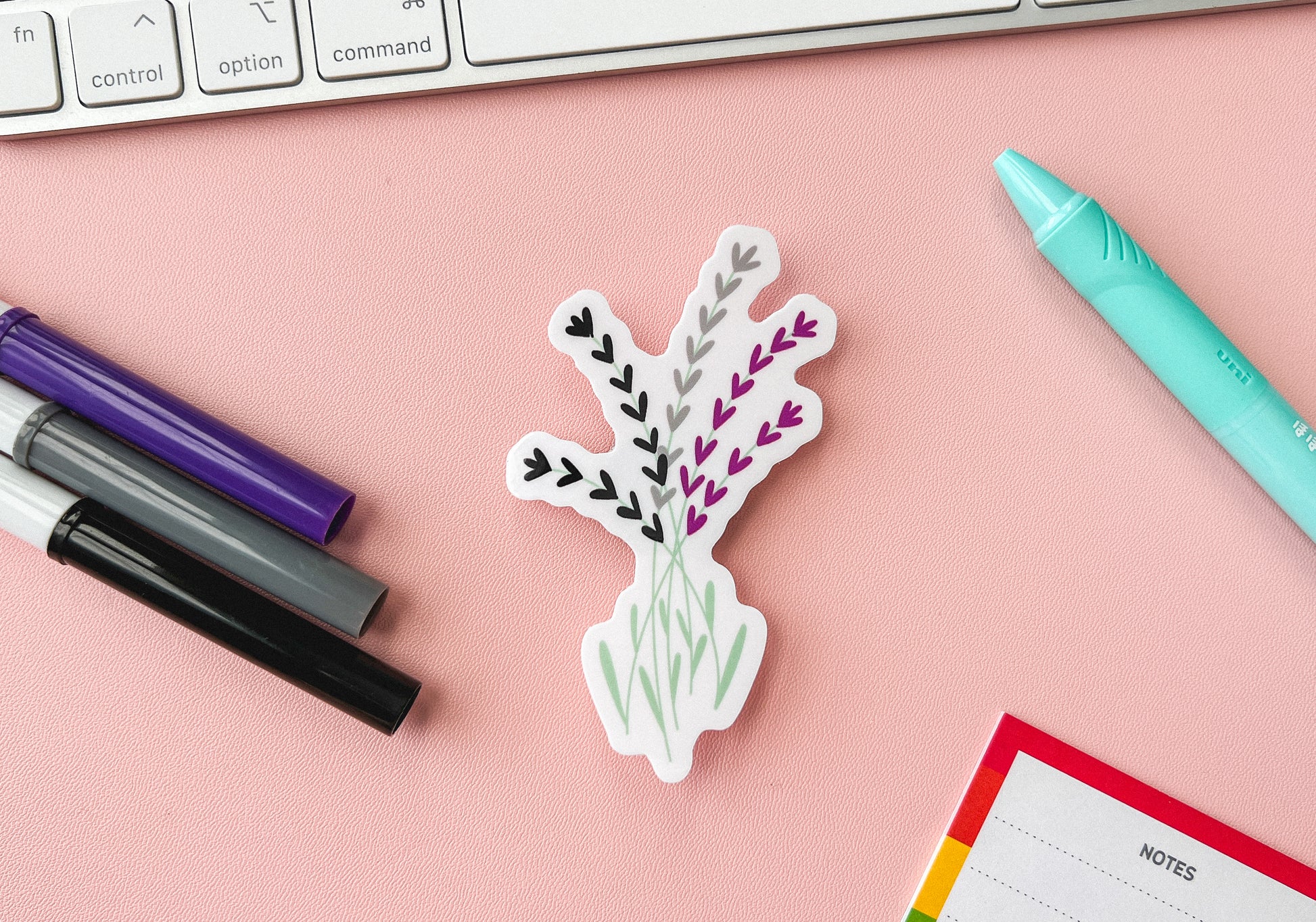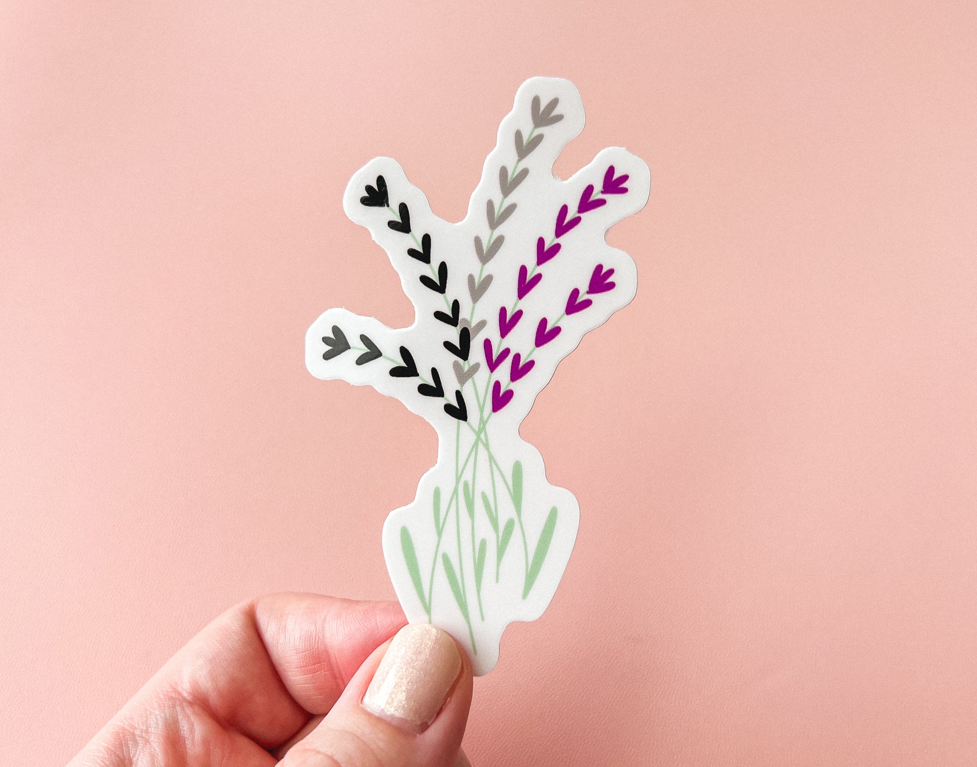 A lovely little die-cut bunch of subtle asexual pride flags/flowers! Perfect for all your subtle asexual pride sticker needs. I don't really know what those might be, but it sounds like a good time.