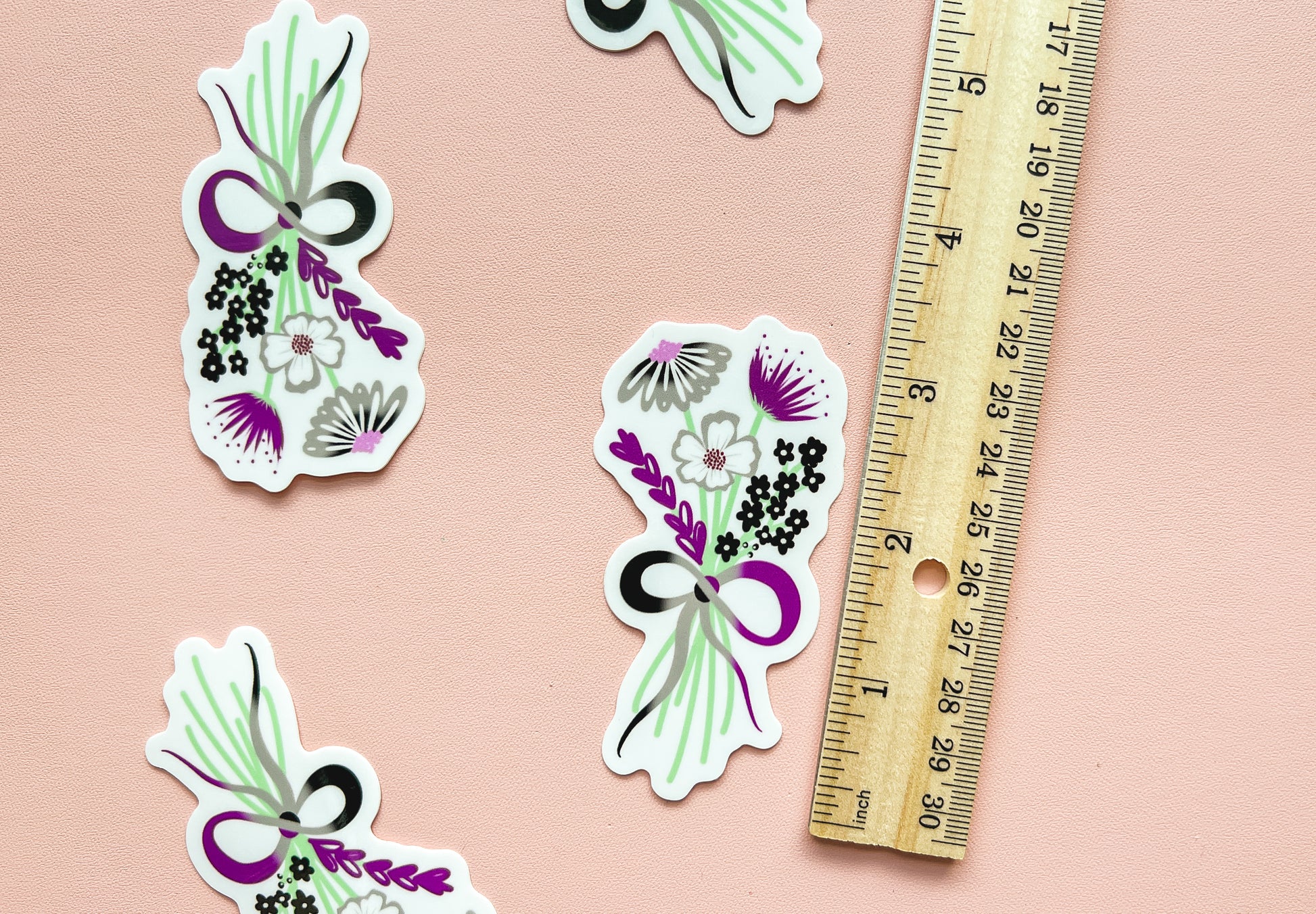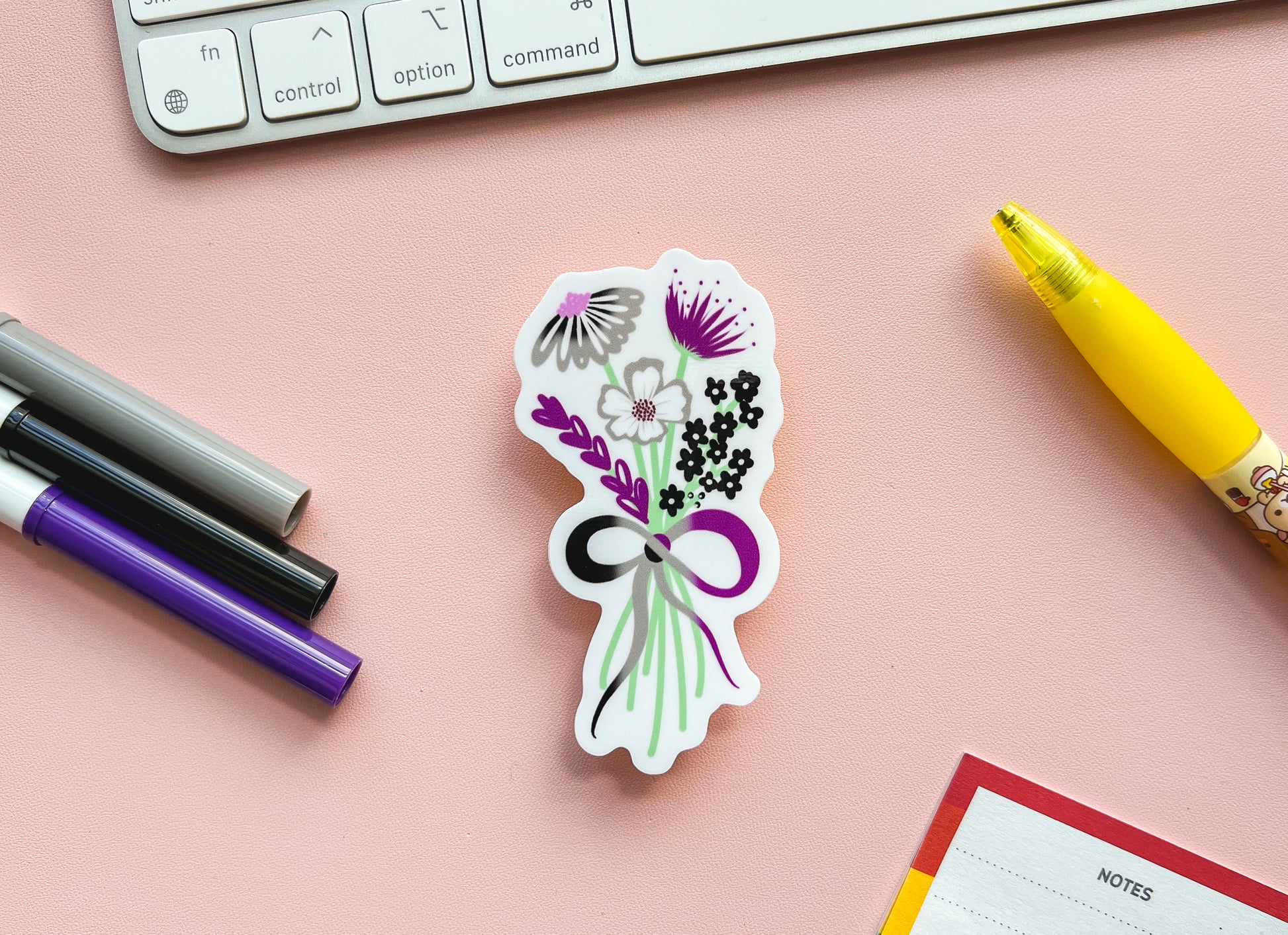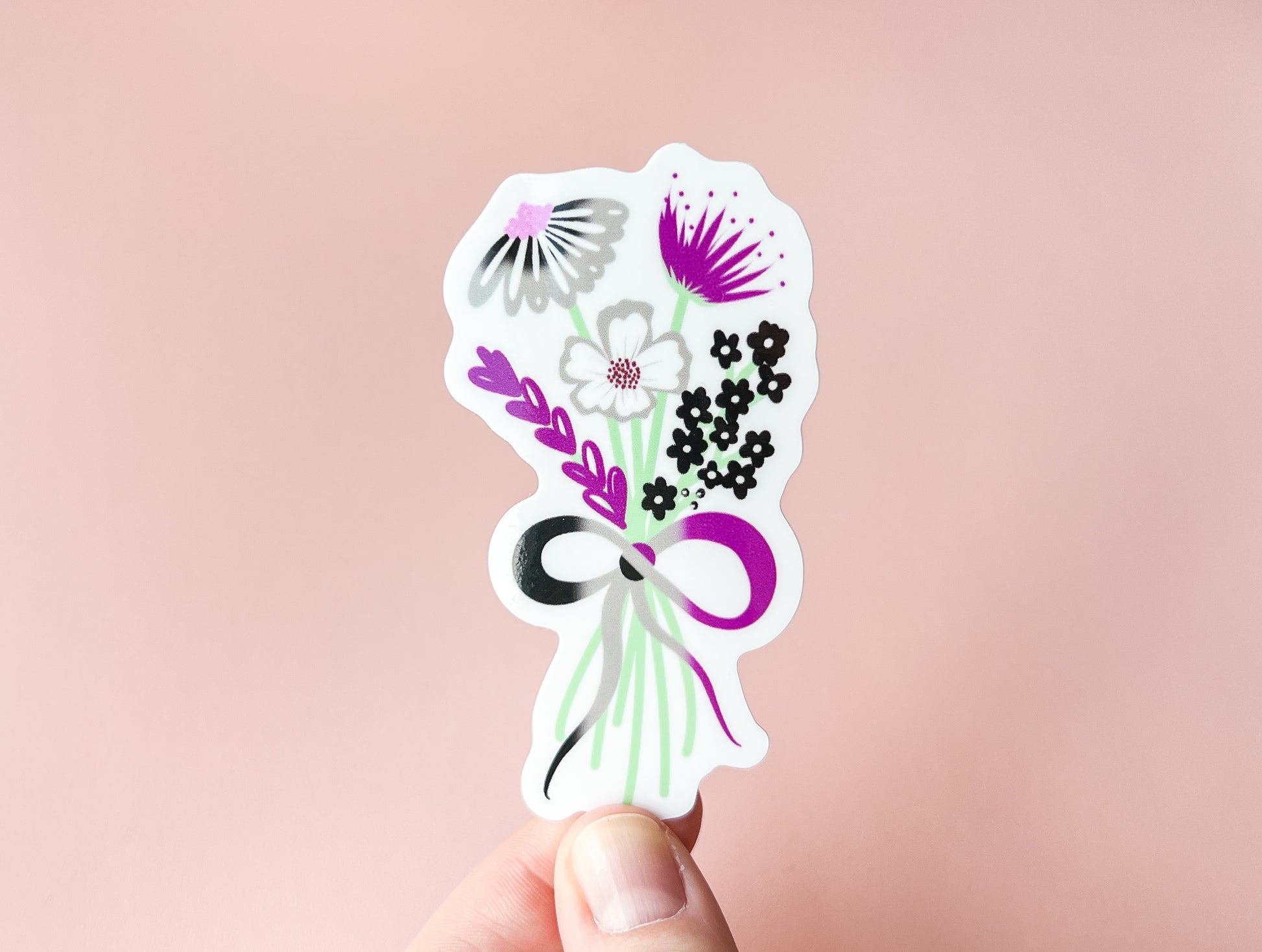 A lovely little die-cut bouquet of subtle asexual pride flags/flowers! Perfect for all your subtle ace pride sticker needs. I don't really know what those might be, but it sounds like a good time.